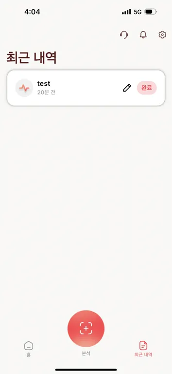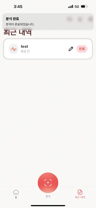 분석이 완료되면 완료로 표시가 변경되며, 어플리케이션 상단에 알림창이 생성됩니다.
