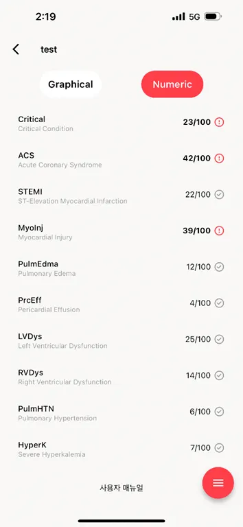 Numeric View는 10가지 디지털바이오마커의 점수를 표기하여 보여줍니다.